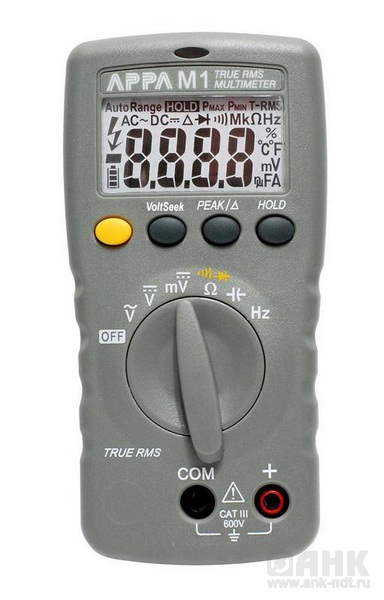 • Измерение переменного (АСV) и постоянного напряжения (DCV) до 600 В, переменного и постоянного тока до 10А, частоты, скважности (%), емкости, сопротивления до 40 МОм, температуры -40... +400 ° С (М3), испытание p-n переходов, проверка целостности цепи (прозвонка со звуковой и световой сигнализацией);