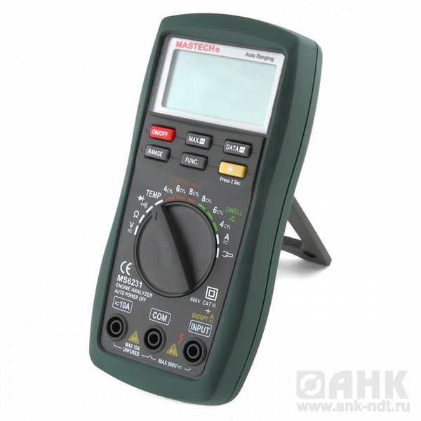 MS6231 позволяет измерять напряжение постоянного и переменного тока, значения постоянного и переменного тока, сопротивление, температуру, количество оборотов коленчатого вала двигателя, значение угла замкнутого состояния контактов прерывателя системы зажигания.