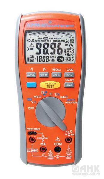 Цифровой тестер изоляции с функцией RMS мультиметра: измерение сопротивления изоляции 1 кОм… 22 ГОм (±1,5 %; U испыт. 50/100/250/500/1000 В), пост./ перем. напряжения (0,1 мВ…1000 мВ/ 0,1В…1000 В), базовая погрешность ± 0,08% (DCV); силы пост./ перем. тока (0,1 мА…400 мА), частоты 0,1 Гц…100 кГц, емкости 4…4 мФ (1пФ), сопротивления 1…40 МОм (0,1 Ом) и целостности цепи, температуры -200… 1200° С, испытание p-n переходов; регистрация Min/ Max/AVG значений; автоустановка 0″ показаний (до 5 Ом), блокировка кн. управления, память (запись/вывод), ЖК-индикатор (10000), 2 области индикации, подсветка дисплея, графическая шкала (48 сегментов), зонд-пробник ДУ, автоудержание результата, авторазряд накопительного конденсатора, питание 1,5 В×4 (тип АА), автовыключение, 96×200×51 мм, масса 0,6 кг