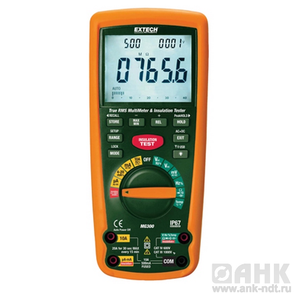 Тестер изоляции IV категории безопасности / Мультиметр с беспроводным интерфейсом для ПК (915 MГц) Extech MG300 с беспроводным USB-интерфейсом для передачи данных измерения на ПК, с большим трехстрочным дисплеем с подсветкой. Диапазон сопротивления изоляции от 0,001 MОм до 4000 MОм.