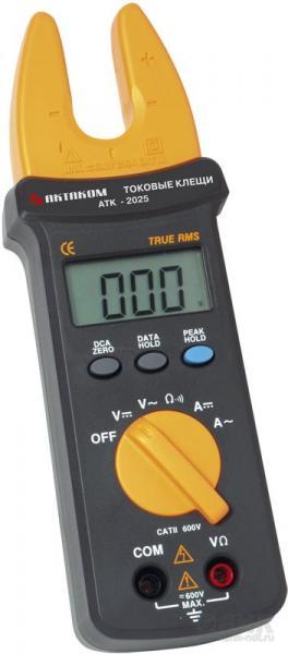 Цифровой бесконтактный измеритель тока АТК-2025 предназначен для измерения постоянного и переменного тока без разрыва силовой цепи, постоянного и переменного напряжения, а также сопротивления цепей и резисторов. В приборе реализована функция удержания показаний и фиксация пиковых значений с отображением результатов измерений в цифровом виде. Функции могут применяться при проведении работ в процессах наладки, ремонта и лабораторных исследований в условиях умеренного климата. Особенностью прибора является специфический трансформатор с магнитопроводом, который имеет узкие постоянно разомкнутые губки. Данная конструкция трансформатора позволяет легко проводить измерения тока в большом скоплении проводников и трудно доступных местах.