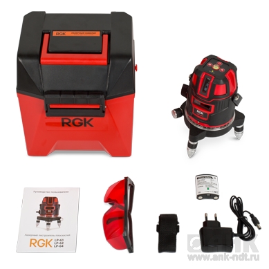 Комплект поставки: лазерный уровень RGK LP-62, кейс, ремень, аккумуляторные батареи, зу для аккумуляторных батарей, очки, инструкция.