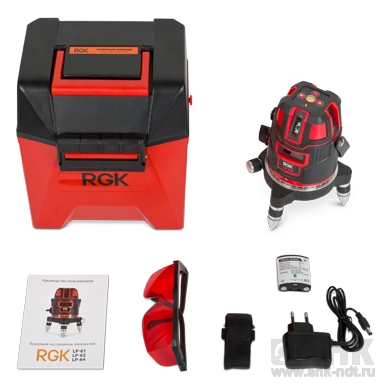 Комплект поставки: лазерный уровень RGK LP-64, кейс, ремень, аккумуляторные батареи, зу для аккумуляторных батарей, очки, инструкция