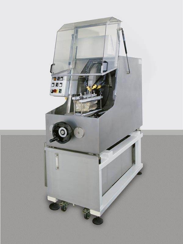Петрографический отрезной станок MT 500 обеспечивает ровный рез без деформаций с максимальной шероховатостью поверхности Ra = 1 мкм). Станок легко может работать с образцами неправильной формы т.к. перемещается не только отрезной диск но и рабочий столик перемещается продольно в ручную или автоматически. Конструкция и материалы из которых изготовлен станок учитывают особенности эксплуатации в тяжелых заводстких условиях. Станок устанавлявается на стальную раму с системой поглащения вибраций. Внутри рамы закреплен бак из нержавеющей стали для охлаждающей жидкостью ёмкостью 250 литров с фильтром и отсеком для сбора отходов резки, что значительно упрощает процесс очистки.