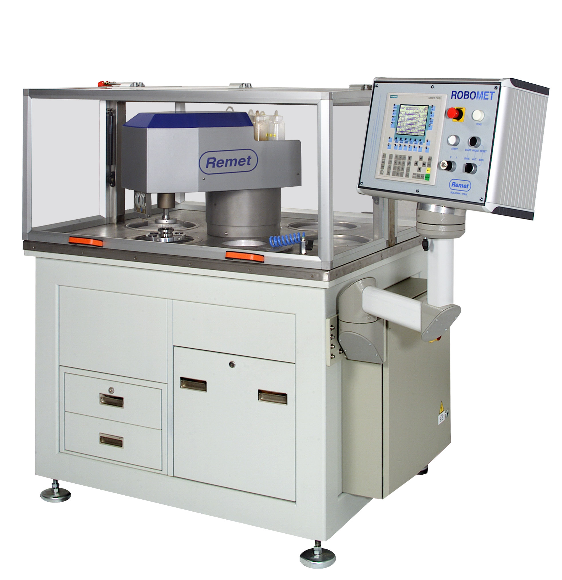 Роботизированный металлографический комплекс - компьютеризированный шлифовально-полировальный станок предназначен для полностью автоматической обработки большого количества металлографических образцов.  ROBOMET включает в себя 5 станций с дисками 200 мм и станцию очистки и сушки. Станок изготовлен из высококачественных материалов и оснащен системой поглощения вибраций.
