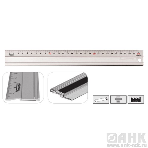 Линейки из твердого алюминия для школ и ручных работ 300, 600 и 1000 мм, на обратной стороне приклеена антискользящая подкладка, предназначены для измерения различных величин, для вычислений и построения чертежей. Определение линейной величины производится путем сравнения нанесенной на измерительный инструмент шкалы и измеряемого объекта. Линейки обычно изготавливаются из дерева, металла, пластика.