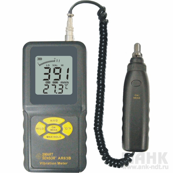 Портативный виброметр AR63B является профессиональным прибором для измерения уровня вибрации. Цифровой виброметр позволяет изменять ускорение, скорость, а также смещение. Все измерения производятся прибором AR63B посредством выносного пьезоэлектрического преобразователя, произведенного из керамического материала. Датчик ускорения передает сигналы вибрации к самому прибору, который преобразует и анализирует измерения. Прибор умеет измерять температуру.Электронный виброметр имеет обширную сферу использования: химическая и нефтяная промышленность, энергетика, транспорт, машиностроение.
