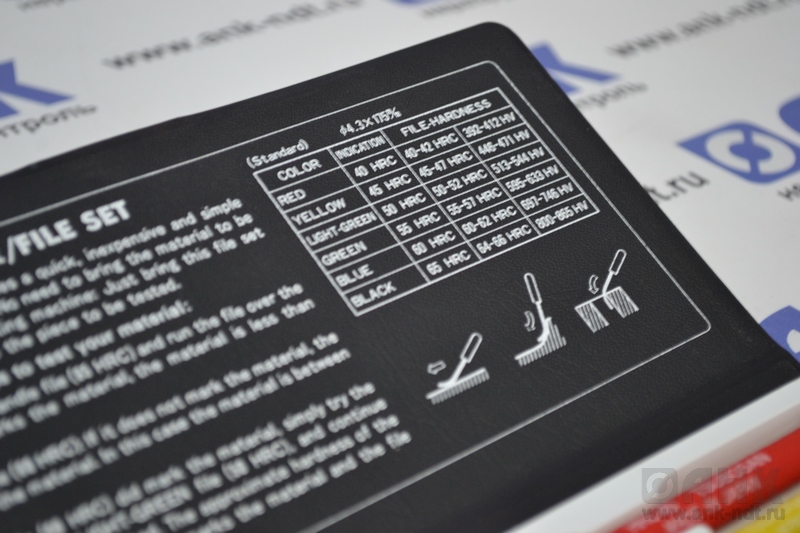 1. Начинайте с ЧЁРНОГО напильника (HRC65) и проведите им по контролируемой поверхности изделия. Если на поверхности осталась царапина - то твёрдость поверхности ниже  HRC65.