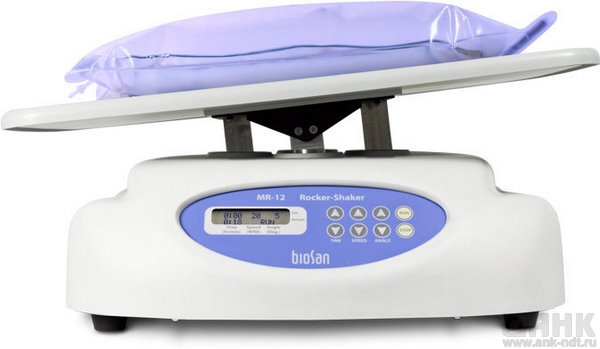 Рокер-шейкер MR-12 обеспечивает как мягкое, так и интенсивное перемешивание растворов или питательных сред в сосудах или пластиковых мешках, размещенных на его платформе.