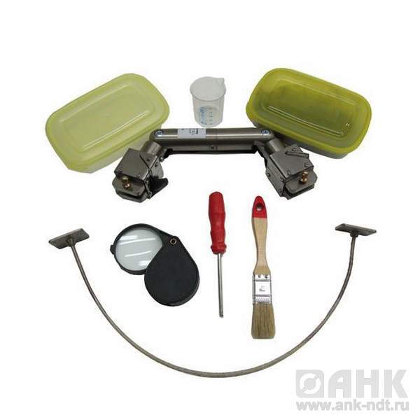 Комплект дефектоскопа МД-6К содержит: контрольный образец с дефектограммой, лупу, мерку для измерения количества порошка для суспензии, тросовую перемычку, магнитопровод шарирнирный и другие приспособления.