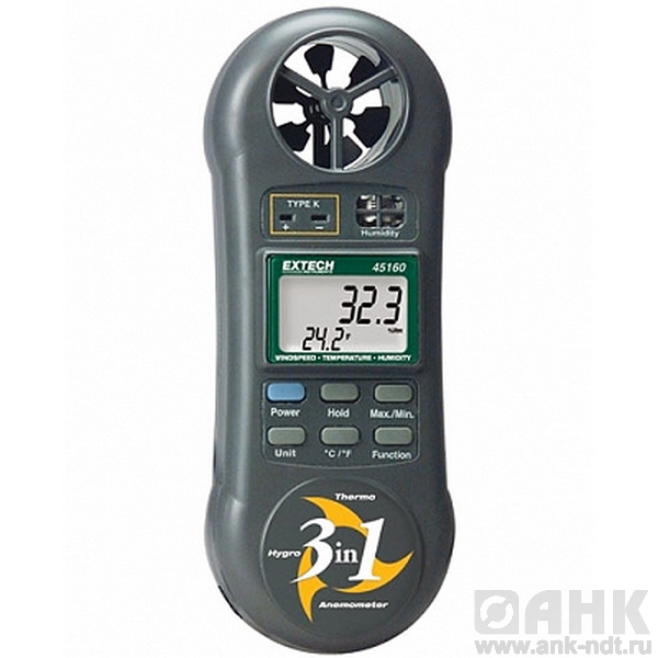 Гигротермоанемометр Extech 45160 - 3 прибора в 1: измеритель влажности, температуры и скорости движения воздуха. Встроенный прецизионный тонкопленочный емкостный датчик влажности с быстрым временем отклика.  Измерение высоких температур при помощи термопары типа К. Встроенный термистор для измерения температуры окружающего воздуха.