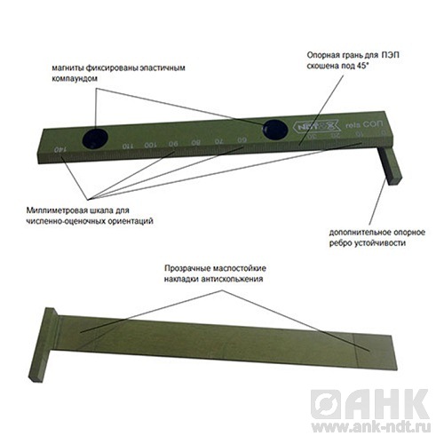 Рейсшина предназначена для обеспечения прямолинейного перемещения наклонных преобразователей на стандартных образцах предприятия (СОП). Линейное перемещение преобразователя обеспечивает удобство поиска и фиксацию максимума амплитуды от искусственного дефекта на СОП при работе, как прямым, так и отраженным лучом. Тщательно подобранное сочетание степени магнитного прижатия и обеспечение антипроскальзывающего эффекта позволяет быстро выставить нужное положение рейсшины на образце и надежно удерживать траекторию перемещения преобразователя на СОПе.