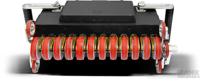 • АР моноблока смонтирована в нижней части прямоугольного корпуса, который снабжён ручками для его удержания. Ручки имеют несколько фиксированных положений, поэтому их можно установить под разными углами к лицевой панели. Все элементы АР имеют независимый подпружиненный подвес и могут перемещаться вдоль своих продольных осей. Это позволит вести контроль не только плоских участков ОК, но и выпуклых с радиусом кривизны от 1400 мм и более, а также и вогнутых с таким же минимальным радиусом.