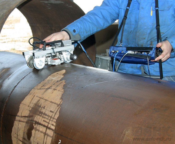 Восьмиканальный ультразвуковой сканер-дефектоскоп УСД-60-8K WeldSpector предназначен для высокопроизводительного ручного ультразвукового контроля сварных швов. Применение современных цифровых технологий позволяет данному ультразвуковому дефектоскопу контролировать сварные соединения со скоростью до 4м/мин. Применение различных сканеров позволяет строить наглядный С-скан сварного шва с точным определением координат дефектов. А мощные магнитные колеса и система слежения за акустическим контактом обеспечивают достоверность контроля и возможность без потери координаты вернуться в любую точку сварного шва. Расположение специальных 4-х канальных преобразователей по обе стороны сварного шва позволило обеспечить его контроль за один проход. Ультразвуковой дефектоскоп сертифицирован в Ростехрегулировании РФ (Свидетельство об утверждении типа средства измерения RU.C.27.003.A №39599 ), зарегистрирован в Государственном реестре средств измерений под №34808-10, имеет разрешение Ростехнадзора и рекомендован для применения на объектах ОАО "Газпром".