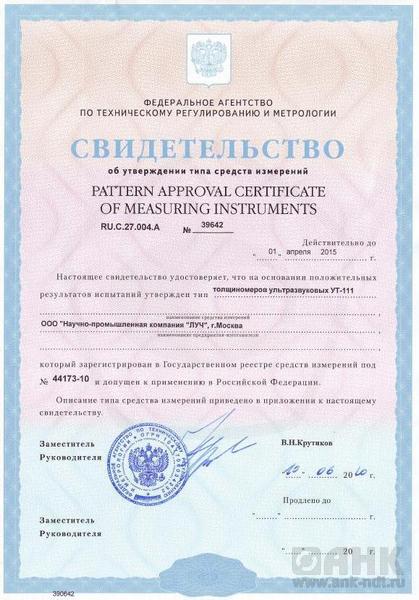 Толщиномер ультразвуковой УТ-111 общего назначения по ГОСТ 28702-90, предназначен для ручного контактного измерения толщины изделий из различных металлов и сплавов, стекла, керамики, полимерных и композиционных материалов, у которых коэффициент затухания ультразвуковых колебаний на частоте 5,0 МГц не превышает 0,3 дБ/см, со скоростями распространения продольных ультразвуковых колебаний (УЗК) от 100 до 9999 м/с при одностороннем доступе к объекту измерения. Толщиномер предназначен для измерения толщины изделий с плоской и выпуклой цилиндрической поверхностями со стороны контакта с УЗ ПЭП. Толщиномер предназначен для эксплуатации в лабораторных и цеховых условиях, на предприятиях черной и цветной металлургии, в машиностроении, химической, нефтедобывающей и нефтеперерабатывающей промышленности и т.п. для контроля остаточной толщины изделий и металлоконструкций, подвергающихся коррозионному, в том числе и атмосферному воздействию. Толщиномер (при использовании соответствующих типов УЗ ПЭП) может контролировать остаточную толщину изделий и металлоконструкций, находящихся под водой: обшивки корпусов судов и плавучих технических средств, стальные листовые и панельные элементы гидротехнических сооружений, трубопроводы, дюкерные переходы и т.п.