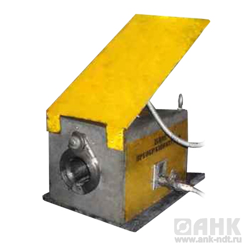 Блок преобразователей (намагничивающее ярмо) предназначен для намагничивания ферромагнитных заготовок при проведении автоматизированного вихретокового контроля труб и прутков диаметром до 170 мм.