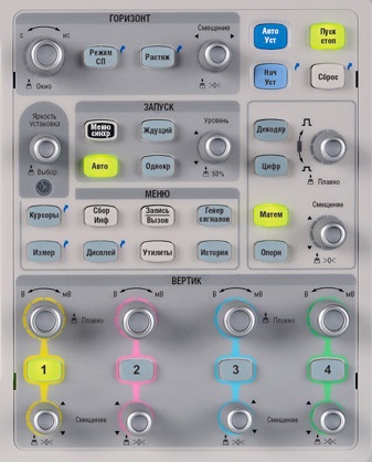 На передней панели приборов расположен ЖКИ, клавиатура, входы аналоговых каналов, входы логического анализатора, разъем интерфейса USB (Host), выход компенсатора пробника, выход функционального генератора.
